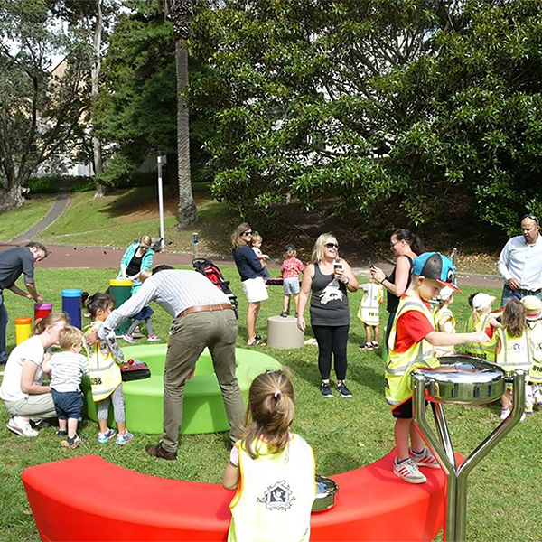 In central Auckland, our partner Playground People, organised a "Demo Day" in local Myers Park. Leith & Kane McFadden (brothers and principals of Playground People Ltd) arranged for several instruments to be available for visitors to come along, have fun in the sun and try some of the instruments for themselves. Rainbow Sambas, Duo Xylophone, Babel Drum, as well as our rainbow Cavatina xylophone and accompanying music book were all ready to be played and Robin was on hand to share his experience and knowledge. The demonstration was a huge success with visitors from the local council, landscape architects, several schools and a local hospital. All of the visitors said how useful it was to see the build standard and to hear the sound quality.